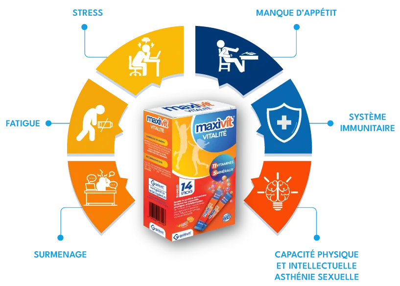 Maxivit® Vitalité est le complément alimentaire idéal pour maintenir l'organisme en forme, booster le système immunitaire et de renforcer les capacités physiques et intellectuelles de l'enfant et de l'adulte face aux agressions externes : Stress, fatigue, surmenage, manque d'appétit.
